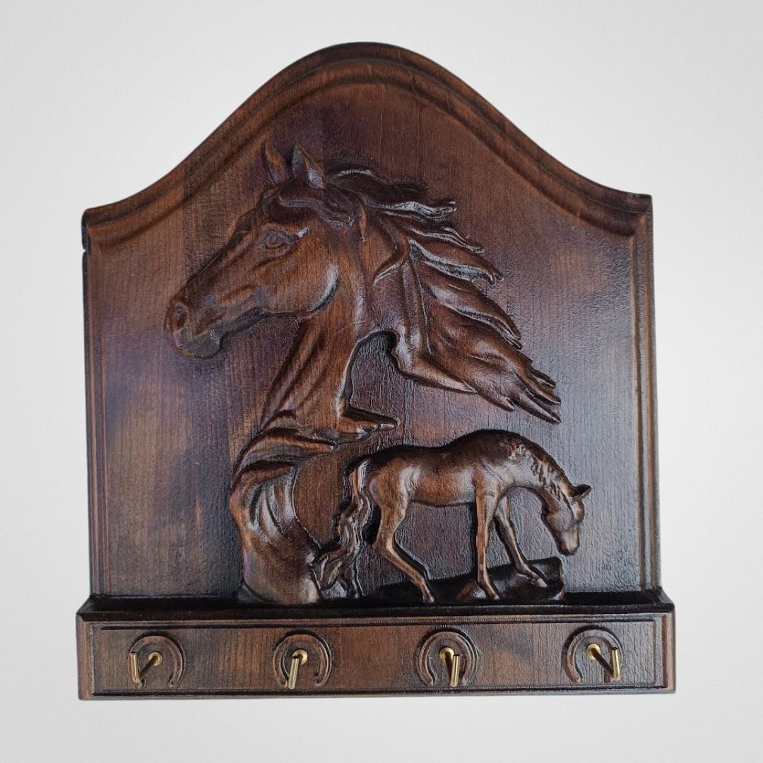 Breloc din lemn sculptat cu cap de cal și motiv de mânz, o completare practică și decorativă pentru casa dvs. Placa din lemn în stil rustic prezintă un decor ecvestru frumos lucrat în partea superioară și patru cârlige metalice în partea inferioară, completate de inserții în formă de potcoavă. Această piesă specială nu este doar o modalitate excelentă de a vă organiza cheile, ci creează și o atmosferă confortabilă în hol, sufragerie sau chiar într-o cameră cu o temă ecvestră. Fabricat din lemn durabil, acesta va fi un companion de încredere pentru mulți ani de utilizare zilnică.