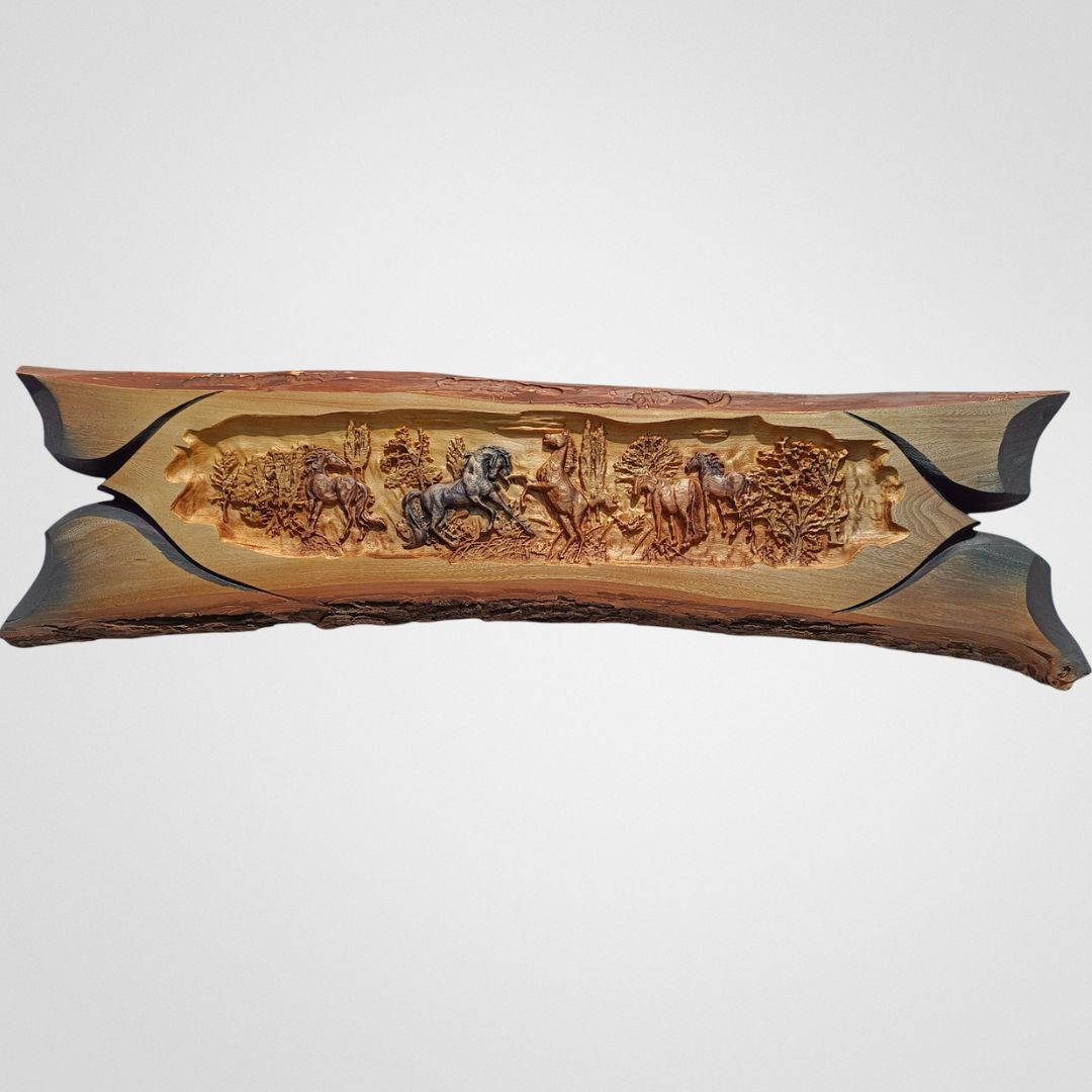 Rustikálna vyrezávaná drevená doska s vyobrazením jazdeckej krajiny, na ktorej je detailne zobrazená krása koní a harmónia prírody. Výjav zobrazuje kone cválajúce a odpočívajúce v lesnom prostredí, čo ornamentu dodáva živú, animálnu atmosféru. Drevená tabuľa s rozmermi 100 × 27 × 2,3 cm je vyrobená z jaseňového dreva s moreným a olejovaným povrchom, ktorý zvýrazňuje prirodzenú štruktúru dreva a zachováva jeho krásu v priebehu času. Jej rustikálne hrany a elegantný dizajn robia každý kus jedinečným. Výborne sa hodí ako špeciálna nástenná dekorácia do obývacích izieb, chodieb alebo spoločenských priestorov s jazdeckou tematikou a môže byť aj hodnotným darčekom pre milovníkov koní.